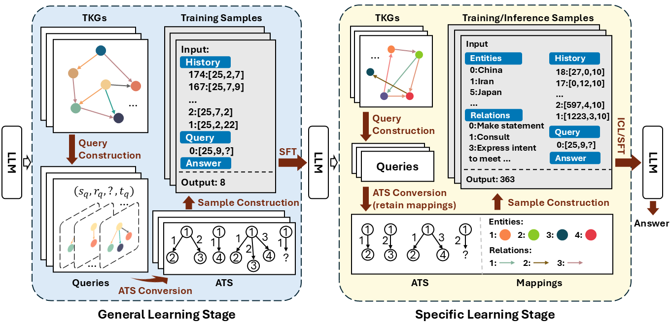 【内容简介】时序知识图谱预测旨在根据历史事实预测未来事实,该任务引起了较多关注。近期工作将大语言模型应用于该任务,从而提升了模型的泛化能力。然而这类工作在预测时同时学习两类相互纠缠的知识:(1)通用模式,即在不同场景下不发生变化的时序结构;(2)场景信息,即参与到特定场景中的事实信息,如实体、关系等。两类知识的学习过程相互干扰,从而影响模型的泛化能力。为提升模型在该任务上的泛化能力,本文提出一种通用到专有的学习框架G2S,该框架将上述两类知识的学习过程解耦。在通用学习阶段,本文将不同时序知识图谱中的场景信息遮盖,将其转化为匿名时序结构。经过在该结构上的学习,模型可以学习不同时序知识图谱上的通用模式。在专有学习阶段,本文通过上下文学习和微调两种方式将场景信息重新注入到结构中。实验结果表明该框架较为有效地提升了大语言模型在时序知识图谱预测任务上的泛化能力。