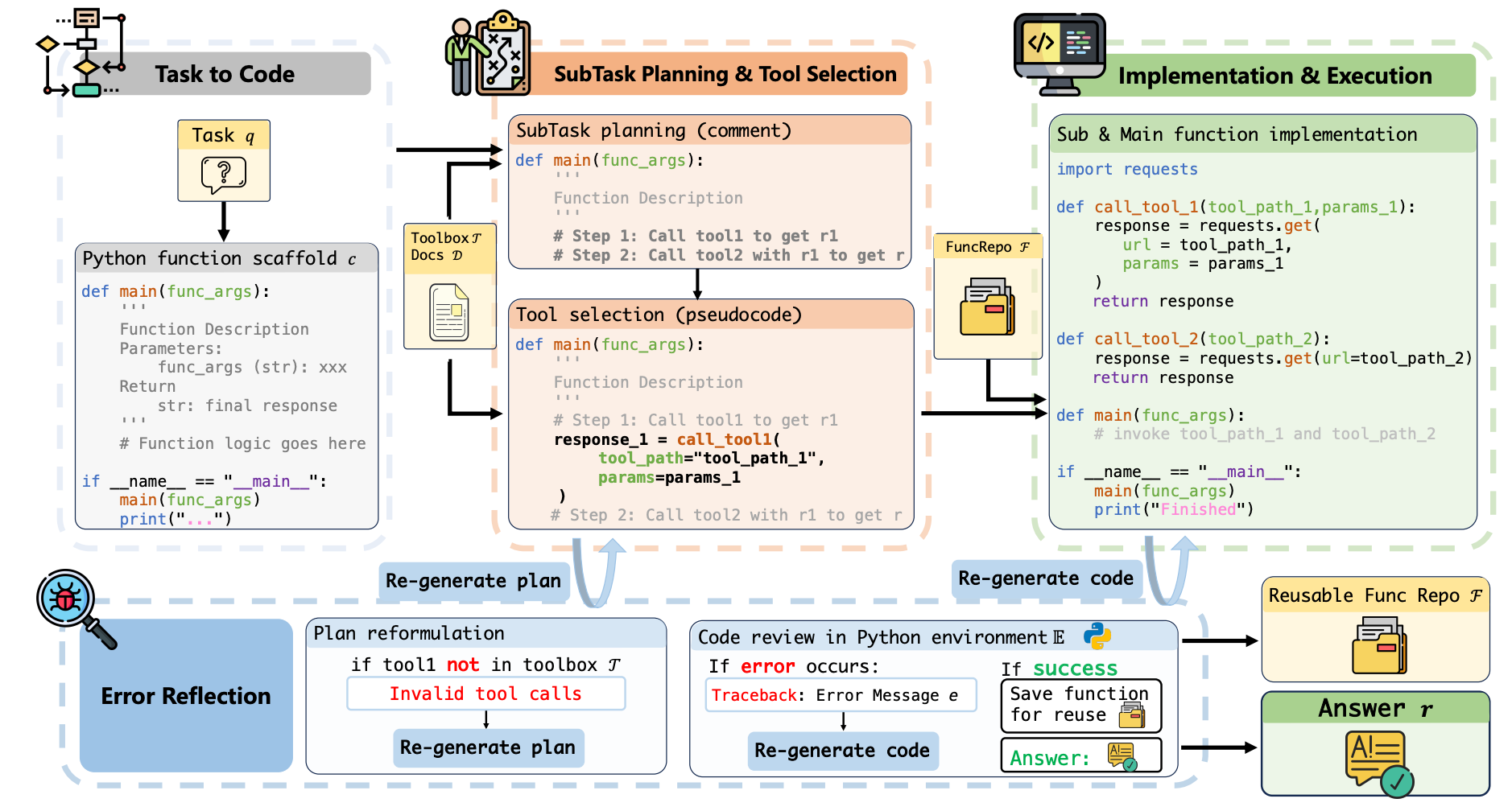 【内容简介】工具学习已成为大型语言模型 (LLM) 通过与外部工具交互解决复杂实际任务的关键能力。现有方法面临着诸多挑战,包括依赖手动输入、难以进行多步骤规划以及缺乏精准的错误诊断和反射机制。我们提出了 ToolCoder,这是一个新颖的框架,它将工具学习重新定义为代码生成任务。受软件工程原理的启发,ToolCoder 将自然语言查询转换为结构化的 Python 函数框架,并使用描述性注释系统地分解任务,使 LLM 能够利用编码范式进行复杂的推理和规划。然后,它生成并执行函数实现以获得最终响应。此外,ToolCoder 将成功执行的函数存储在存储库中,以促进代码重用,同时利用错误回溯机制进行系统性调试,从而优化执行效率和鲁棒性。实验表明,ToolCoder在任务完成准确性和执行可靠性方面比现有方法取得了卓越的表现,确立了以代码为中心的方法在工具学习中的有效性。