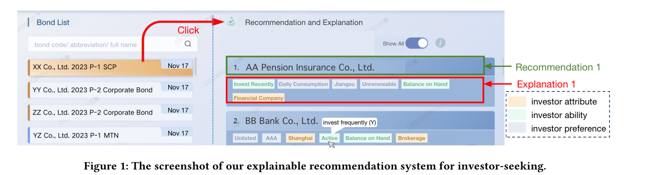【内容简介】推荐系统是提升信息过滤与发现效率的重要工具,已广泛应用于消费领域,并在专业领域展现出巨大潜力。然而,在专业场景中仅提供推荐结果远远不够,必须辅以可信、简明的解释,才能真正支持决策采纳。本研究聚焦于专业场景(以一级债券承销中的投资者挖掘为例)的可解释推荐系统。当前流行的LIME、SHAP等基于特征归因的解释方法存在冗余(redundant)与伪相关(spurious)问题:它们分别评估特征重要性,忽视特征间关联,导致解释信息重复或与业务事实相矛盾,从而削弱说服力。针对这些问题,论文提出ConciseExplain框架——以“充分值 (sufficiency value) ”为目标,通过1.掩码训练策略(Mask Training Strategy,MTS):在训练阶段随机屏蔽特征并学习专用“掩码向量”,让同一模型既能做推荐,又能评估任意特征子集的充分值;2. 梯度优化选特征:在推理阶段对特征门控向量做梯度下降,直接搜索能最大化充分值、且个数受限的最优特征子集,从而同步减少冗余并排除伪因。在真实债券数据上,ConciseExplain相较最佳基线合理性提升6.1%、多样性提升12.4%,综合指标相对提升 9.2%。