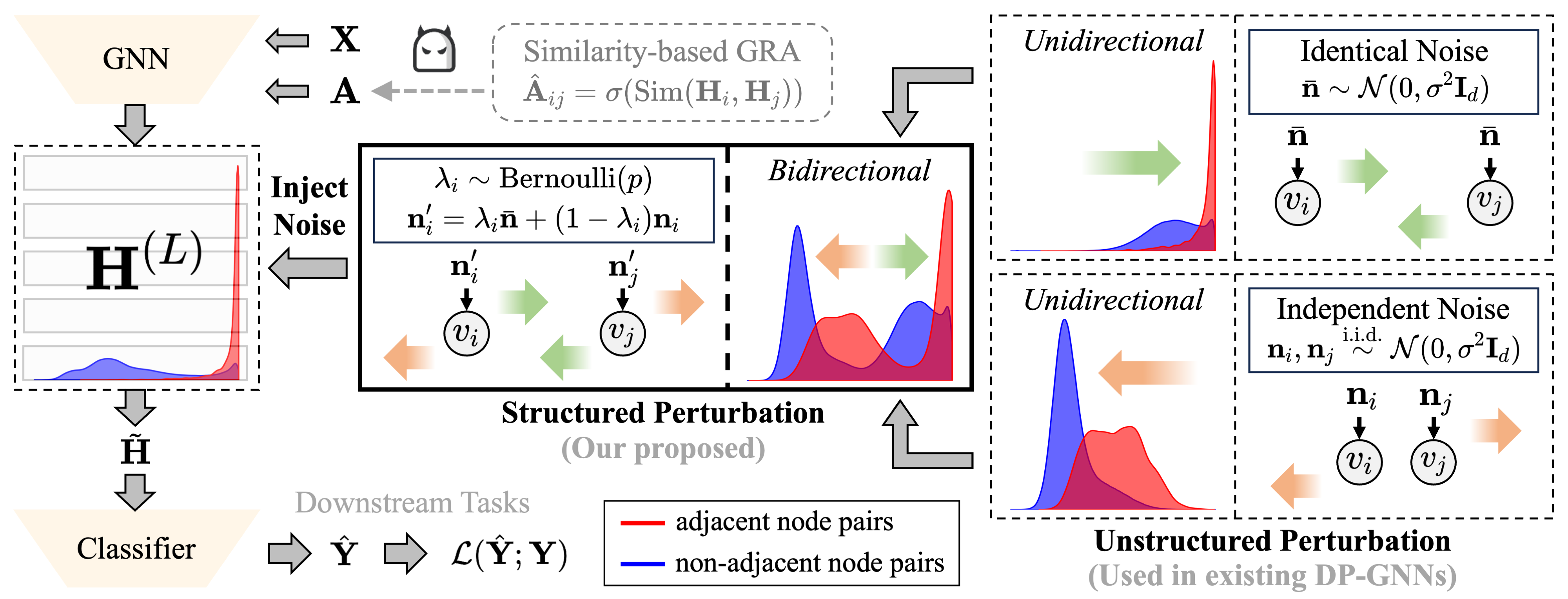 【内容简介】论文揭示了现有的差分隐私图神经网络在应对图重构攻击(Graph Reconstruction Attack,GRA)方面效果有限,未能有效防止敏感图结构的信息泄露。进一步,将这一防御能力的缺失归因于现有方法采用的非结构化扰动机制,该机制仅能引起嵌入相似度分布的单向偏移。具体而言,这类扰动通常会降低所有节点对的嵌入相似度,但未能显著破坏其相对排序,从而使攻击者仍可利用相似度排序重建原始图结构。为克服非结构化扰动在抵御GRA方面的固有缺陷,论文提出了一种基于结构化扰动的差分隐私图神经网络GRASP。该方法基于观察到的现象:独立噪声倾向于降低相似度,而相同噪声倾向于提升相似度。通过引入伯努利机制融合这两类噪声,GRASP实现了对嵌入相似度分布的双向扰动,有效打乱了节点对的相似度排序,从而显著提升了对GRA的防御能力。在八个基准数据集上的实验证明,GRASP在提升隐私保护能力的同时,实现了更优的隐私与效用权衡,相较现有的图结构保护方法具有显著优势。