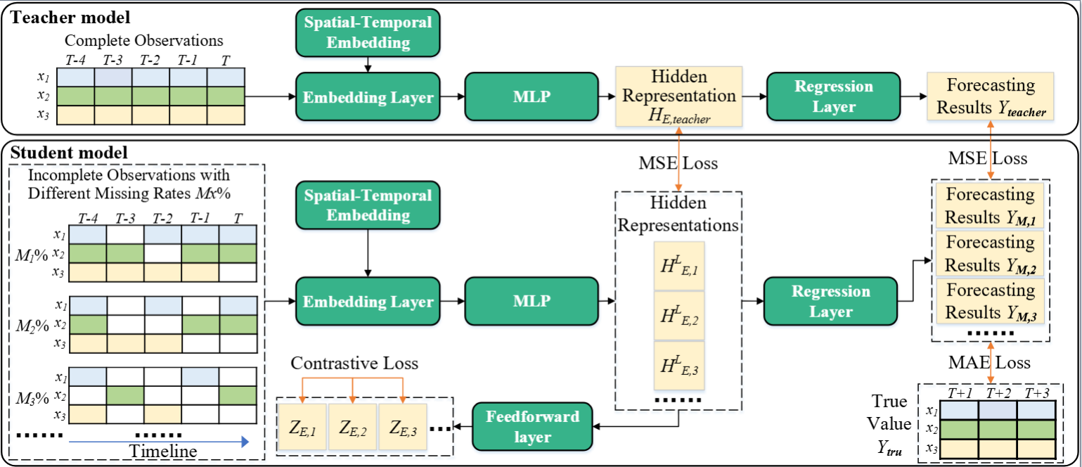 【内容简介】多元时间序列预测(MTSF)是指对多个相互关联的时间序列的未来值进行预测。目前,深度学习模型因其强大的语义(时间序列的全局和局部信息)挖掘能力而获得了广泛关注,但是它们普遍容易受到数据收集器故障导致的缺失值的影响。这些缺失值不仅破坏了MTS的语义,而且它们的分布也随着时间而变化。然而,现有模型对上述问题缺乏鲁棒性,导致预测性能欠佳。为此,本文提出了多视图表征学习 (Merlin),它可以帮助现有模型实现不同缺失率的不完整观测值与完整观测值之间的语义对齐。Merlin包括离线知识蒸馏和多视图对比学习两个关键模块。前者利用教师指导学生的思路从不完整观测中挖掘出类似于能从完整观测中获得的语义。后者通过学习由不同缺失率的不完整观测构建的正/负数据对,提高学生模型的鲁棒性,确保不同缺失率的语义对齐。因此,Merlin能够有效地增强现有模型对不固定缺失率的鲁棒性,同时保持预测的准确性。在四个真实数据集上的实验证明了Merlin的优越性。