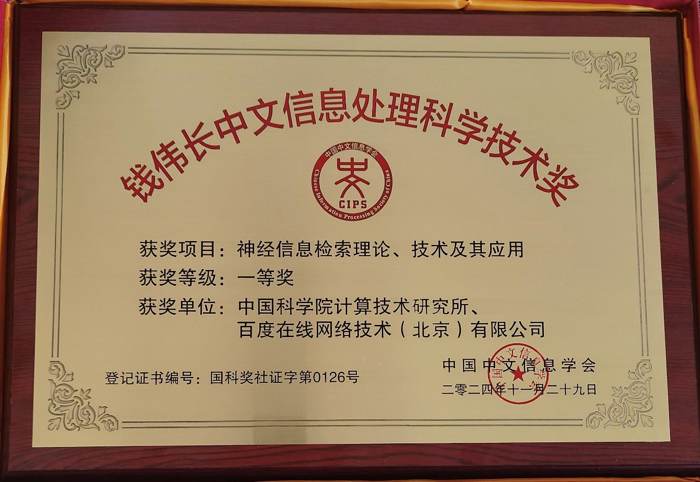 2024年11月29日,中国中文信息学会公布了2024年中国中文信息学会科学技术奖 -“钱伟长中文信息处理科学技术奖”奖励名单。计算所牵头申报的成果“神经信息检索理论、技...