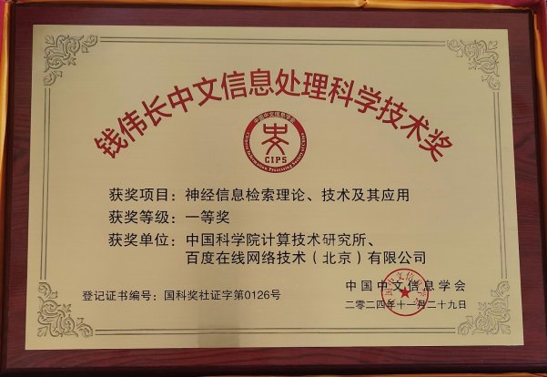 计算所牵头申报的成果“神经信息检索理论、技术及其应用”荣获2024年中国中文信息学会科学技术奖 -“钱伟长中文信息处理科学技术奖”一等奖。该项目由郭嘉丰、殷大伟、程学旗等人共同完成,计算所为第一完成单位。