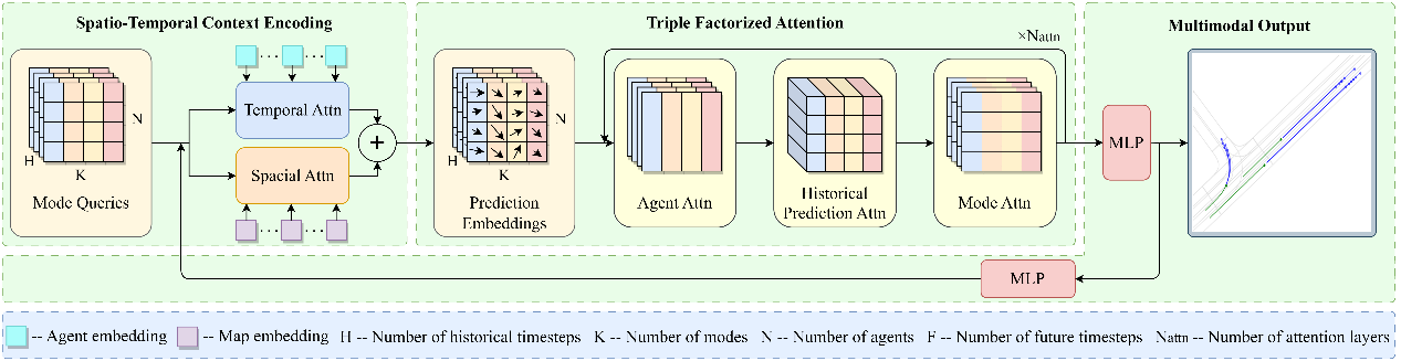 内容简介:预测道路参与者的轨迹对自动驾驶系统至关重要。最近的主流方法遵循静态范式,使用固定数量的历史帧来预测未来的轨迹。然而,即使在相邻的时间戳上,这些方法的预测结果也是独立的,可能导致潜在的不稳定性和时间不一致性。由于连续的时间戳的预测具有大量重叠的历史帧,因此它们的预测应该具有内在的相关性,例如预测轨迹的重叠部分应该是一致的,或者根据道路情况有所不同但保持相同的运动目标。基于此,本文提出了一种新的动态轨迹预测方法HPNet。为了稳定和准确的轨迹预测,我们的方法不仅利用了历史帧(包括地图和智能体状态信息),还利用了历史预测。具体来说,我们设计了一个历史预测注意(Historical Prediction Attention)模块来自动编码连续预测之间的动态关系。此外,受益于历史预测,它还将注意力范围扩展到了当前可见窗口之外。我们将提出的Historical Prediction Attention与Agent Attention和Mode Attention进一步组成三维分解注意(Triple Factorized Attention)模块,这也是HPNet的核心设计。在Argoverse运动预测基准上的实验表明,HPNet达到了最先进的性能,并生成了准确而稳定的未来轨迹。