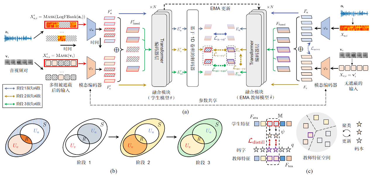 内容简介:近年来,音-视语音表示学习(audio-visual speech representation learning)任务因其在唇语识别、多模态语音识别、语音增强等方面的应用备受学界关注。当下的方法(如AV-HuBERT等)大多依赖于音频模态的单一引导,重点学习音视共性信息。本文考虑到两模态间固有的不对称性,提出一种全新的鲁棒音-视语音表示自监督学习策略ES³,从学习模态间共性(shared)信息、各模态的特异性(unique)信息和协同增益(synergistic)信息的角度重新审视这一任务,渐进地构建出鲁棒的音/视单模态表示和音-视联合表示。具体而言,我们首先从较容易学习的音频的特异性信息和音视两模态间的共性信息开始学习;在此基础上,继续学习视觉模态(即唇语)的特异性信息,并形成初步的音-视联合表示;最后,最大化包括协同增益信息在内的总的音-视语音信息。我们用一个简单的孪生网络对该策略加以实现,并在两个英文数据集(LRS2-BBC、LRS3-TED)和我们新收集的大规模中文句子级数据集CAS-VSR-S101上通过实验验证了其有效性;特别是在LRS2-BBC数据集上,我们采用规模最小的模型,以1/2的参数量和1/8的无标注数据量(223小时)便取得了与SoTA自监督方法可比的性能。