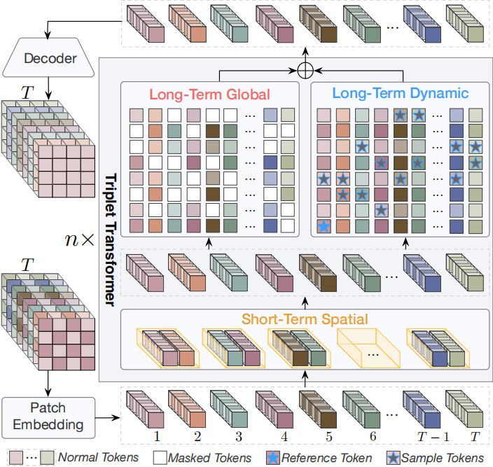 内容简介:视频和谐化是一项重要且极具挑战性的视觉任务,它旨在通过自动调整合成视频前景的外观以使其与背景一致,从而获得视觉上逼真的合成视频。受手动和谐化操作中对短期和长期视频帧渐进调整过程的启发,我们提出一种视频三元Transformer框架来建模视频中的三种时空变化模式,即短期帧空间、长期帧全局和长期帧动态,用于类似视频和谐化等视频到视频的转换任务。具体而言,对于短期帧和谐化,我们利用相邻帧间的细微变化来调整前景外观,以使其在空间维度上与背景一致; 对于长期帧和谐化,我们不仅探索全局外观变化以增强视频的时序一致性,还在避免运动偏移影响下动态地对齐相似上下文的外观。大量实验证明了我们方法的有效性,在视频和谐化、视频增强和视频去摩尔纹任务中取得最先进的性能。我们还提出一种时序一致性度量指标来更好地评估和谐化视频。