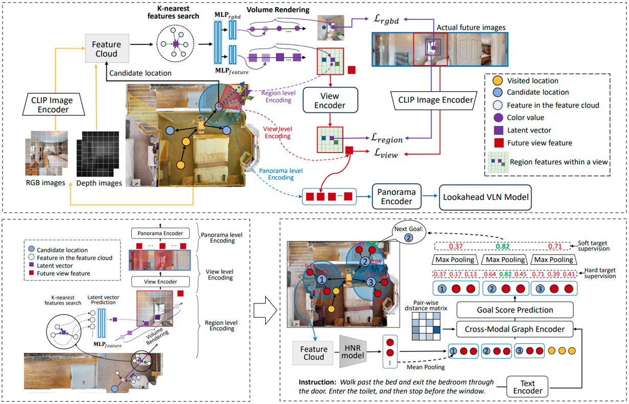 内容简介:视觉语言导航(VLN)要求智能体能够在三维环境中基于给定的自然语言指令导航到目标位置。以往的视觉语言导航方法仅做单步动作预测,缺乏长远动作规划能力。为了实现更准确的导航路径规划,本文提出了基于神经辐射场的前瞻探索策略,旨在渲染未来的环境来实现更准确的动作预测。不同于之前工作预测未知环境的RGB图像从而带来图像预测失真和高昂计算开销的问题,本文所提出的方法基于大规模预训练的层次化神经辐射表征模型,利用三维特征空间编码预测未来环境的视觉表征,相较于预测像素级图像方法更高效和更鲁棒。更进一步地,使用所预测出的未来环境表征,所提出的前瞻导航模型能够构建出可导航的未来路径树,并通过并行评估各分支的行动价值选择最优的导航路径。我们在连续环境下视觉语言导航的多个数据集上验证了所提方法的有效性。
