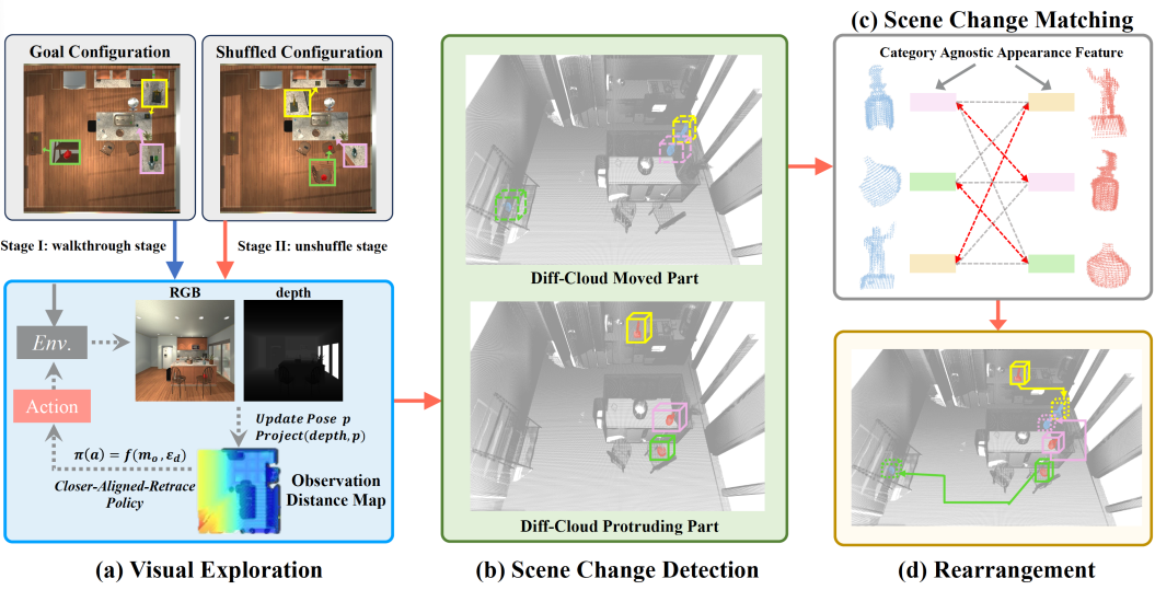 内容简介:本文针对归纳还原任务提出一种类别无关的模型,该模型可以帮助具身智能体在不依赖任何类别概念的情况下,将场景由打乱状态转变为目标状态。现有方法通常遵循类似的框架,即通过根据目标环境和打乱环境的语义场景图之间的匹配来完成归纳还原任务。然而,构建场景图需要推断类别标签,这不仅导致整个任务的准确率下降,而且限制了在现实世界场景中的应用。因此本文深入探讨了归纳还原的本质,并专注于两个最基本的问题:场景变化检测和场景变化匹配。我们利用点云的移动和突出来准确地识别场景变化,并根据与类别无关的外观特征的相似性来匹配这些变化。此外,为了帮助智能体更有效和全面地探索环境,我们提出了一种更紧密对齐的探索策略,旨在更近的距离观察场景的更多细节。我们在基于RoomR数据集的AI2THOR归纳还原竞赛以及我们自行收集的新型多房间多实例数据集MrMiR上进行了实验。实验结果充分证明了我们提出方法的有效性。