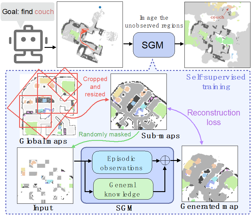 内容简介:物体目标导航任务要求代理在未见过的环境中导航到指定的目标物体。由于环境布局未知,代理需要从部分观测中推断未知的上下文物体,从而推断出目标物体的可能位置。以往的端到端强化学习方法通过隐式表示学习这些上下文关系,但它们缺乏几何关系而限制其泛化性。另一方面,模块化方法为观察到的导航环境构建局部语义地图,语义地图包含了观测到的几何关系,然而,模块化的方法因为缺乏对上下文关系的推理,而限制了探索效率。在这项工作中,我们提出了自监督生成地图(Self-Supervised Generative Map, SGM),一种通过自监督学习显示地学习上下文物体关系的模块化方法。SGM被训练以利用情节观察和一般知识重构裁剪的全局地图的遮蔽像素。在导航过程中,代理维护一个不完整的局部语义地图,同时,局部地图的未知区域由预训练的SGM生成。基于扩大的局部地图,代理设置目标物体的预测位置为目标并朝向它移动。基于Gibson、MP3D和HM3D上的实验验证了我们方法的有效性。
