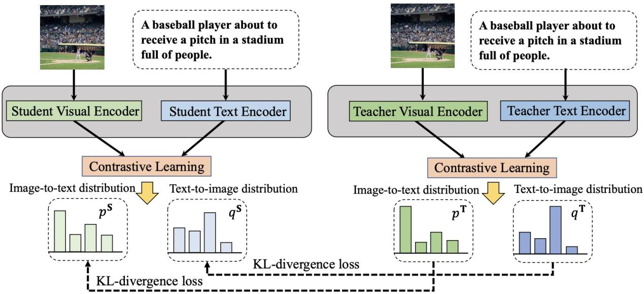 内容简介:对比语言-图像预训练模型CLIP已经成为一个广泛应用的多模态基础模型,展现出很强的零样本泛化能力,提升了下游视觉识别任务的性能。现有的CLIP通常采用大型模型,虽然性能好,但是复杂度较高,难以应用在资源受限的场景下。小型CLIP模型虽然复杂度低,但是性能较差,难以满足任务精度的需求。为了解决此问题,本研究提出CLIP知识蒸馏技术,通过将大型模型的知识迁移到小型模型,从而使得小型模型在不改变复杂度的情况下显著提升性能。本研究从关系、特征、梯度和对比模式方面探索了CLIP的知识形式,并发现采用特征对齐和交互式对比学习能显著提升CLIP知识蒸馏的效果。本研究发现不同的CLIP知识蒸馏方法能取得效果的原因在于增加了教师-学生模型之间的特征相似度。根据零样本ImageNet图像分类实验表明,大规模数据集Laion-400M上预训练的ViT-L/14教师提升了在CC3M+12M数据集上训练的ViT-B\16学生模型20.5%的分类准确率。