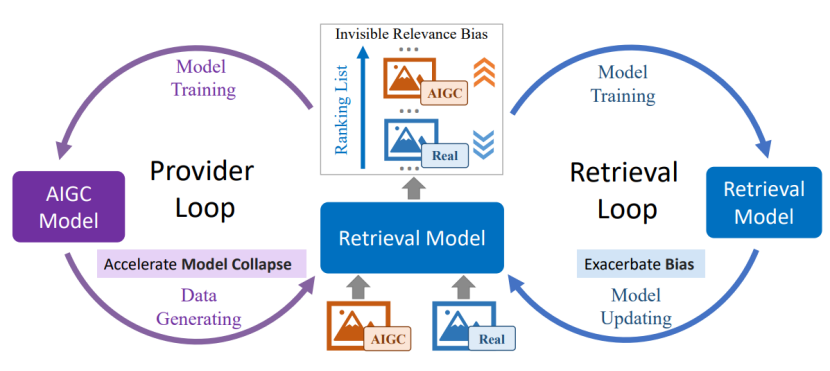 内容简介:随着生成模型的应用,互联网日益充斥着由AI生成的内容(AIGC),导致真实内容和AI生成的内容都被索引到搜索的语料库中。本文探讨了在这种情况下,AI生成的图像对文本-图像搜索的影响。首先,我们构建了一个包含真实图像和AI生成图像的基准测试,用于这项研究。在这个基准测试中,AI生成的图像具有与真实图像足够相似的视觉语义。对这个基准测试的实验揭示,文本-图像检索模型倾向于将AI生成的图像排在真实图像之前,即使AI生成的图像并没有比真实图像更多地展示与查询相关的视觉语义。我们将这种偏见称为无形的相关性偏见。这种偏见在不同训练数据和架构的检索模型中都被检测到,包括从头开始训练的模型和那些在大量图像-文本对上预训练的模型,包括双编码器和融合编码器模型。进一步的探索揭示,将AI生成的图像混入检索模型的训练数据会加剧无形的相关性偏见。这些问题导致了一个恶性循环,即AI生成的图像有更高的机会从大量数据中被暴露出来,这使得它们更有可能被混入检索模型的训练中,而这样的训练使得无形的相关性偏见越来越严重。为了解决上述问题并阐明无形相关性偏见的潜在原因,首先,我们引入了一种有效的训练方法来减轻这种偏见。随后,我们应用我们提出的去偏方法来追溯识别无形相关性偏见的原因,揭示出AI生成的图像诱导图像编码器将额外的信息嵌入到它们的表示中,这些信息使得检索器估计出更高的相关性分数。本文的发现揭示了AI生成的图像对文本-图像检索的潜在影响,并对进一步的研究有所启示。